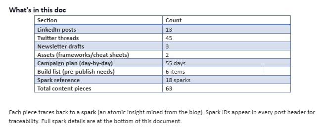 I want you to see what this feels like. Because once you see 100+ posts sitting in a Google Doc, all from something you already wrote, the way you think about content changes forever.