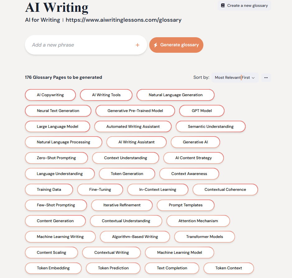 You click a button. It generates 200 - 500 terminology pages for your site. Definitions, examples, internal links. The whole thing.
